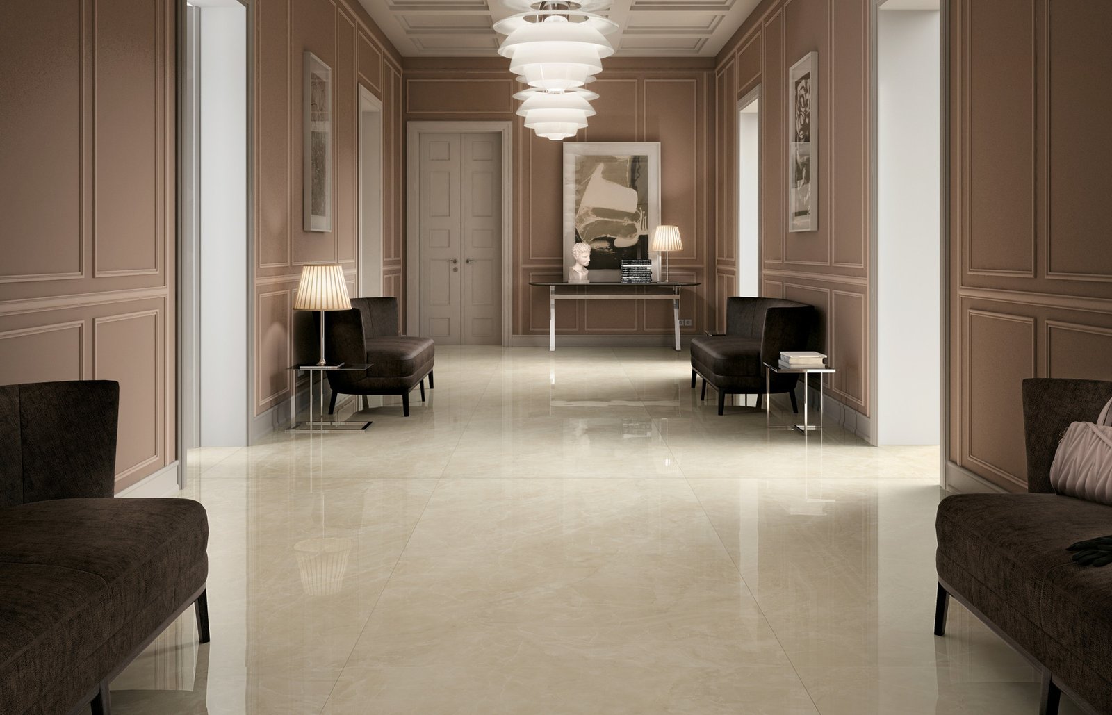 Installation of bookmatched or large format tiles for living and entertainment spaces, creating striking, elegant floors.